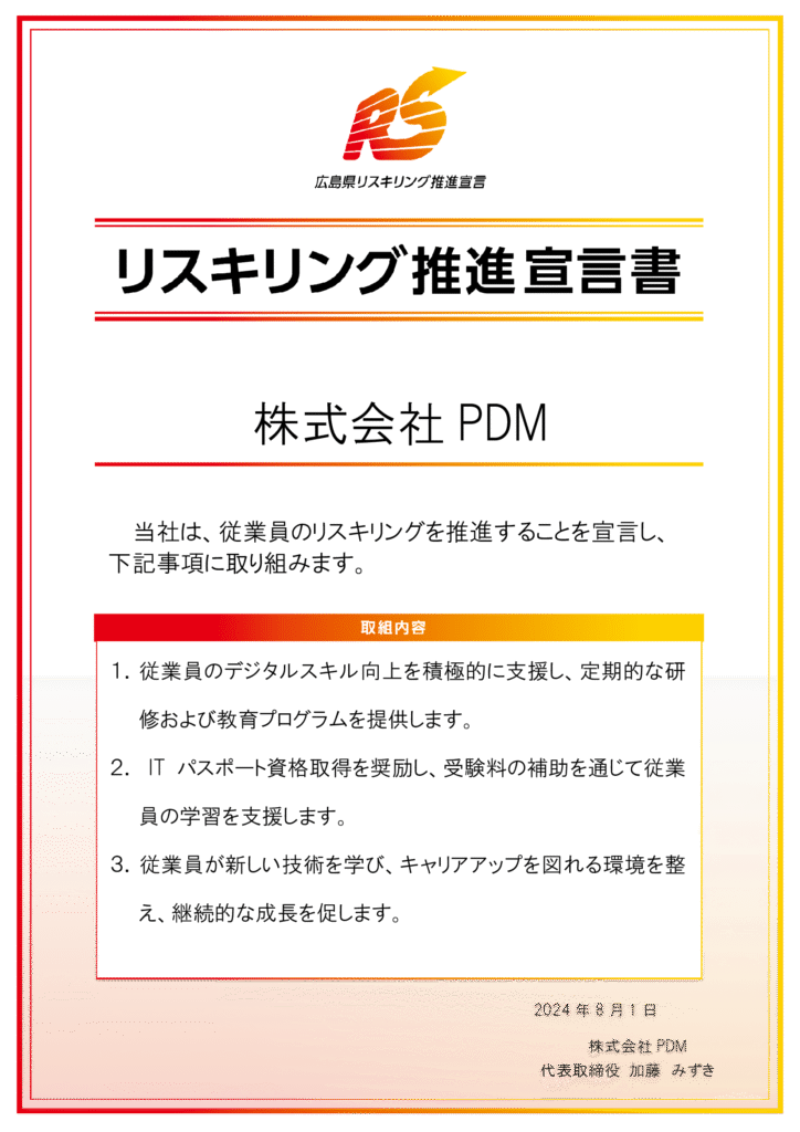新着情報 リスキリング推進宣言書を策定しました。 2025.07.14 当社は、従業員が新たな業務等に必要となるスキルや知識を習得するための支援策として「リスキリング推進宣言書」を策定しました。 【社名変更および事務所移転のお知らせ】 前の記事 「SDGs宣言」を策定しました 次の記事