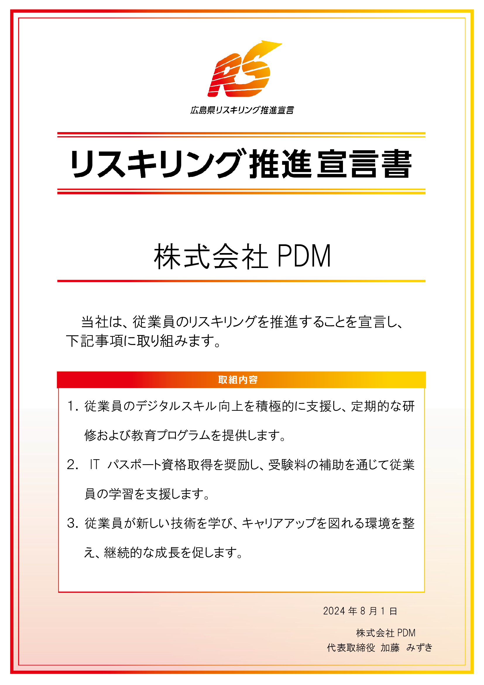 株式会社PDMは、従業員が今後の新たな業務などで必要となるスキルや知識を習得することを支援するため、リスキリング推進の取組を宣言します。